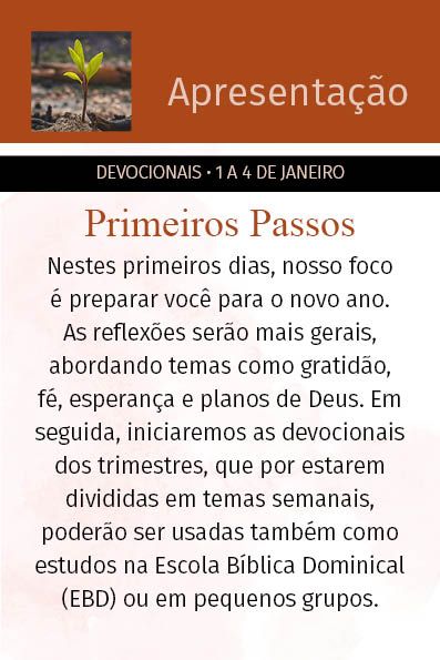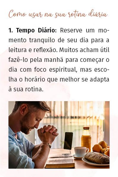 Assim como a terra precisa ser preparada para receber a semente, nosso coração precisa estar nas condições ideais para receber o que Deus tem para nós. O Devocional Dias de Bênçãos é a ferramenta certa para isso, guiando você em temas semanais, reflexões diárias e orações inspiradoras. Comece 2025 com dedicação e propósito, e colha os frutos de uma vida mais próspera e intensa com Deus.